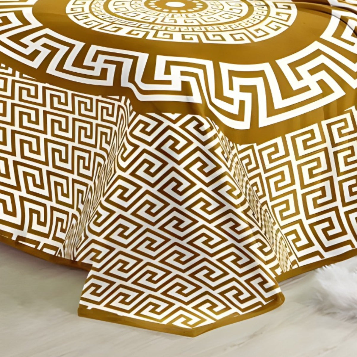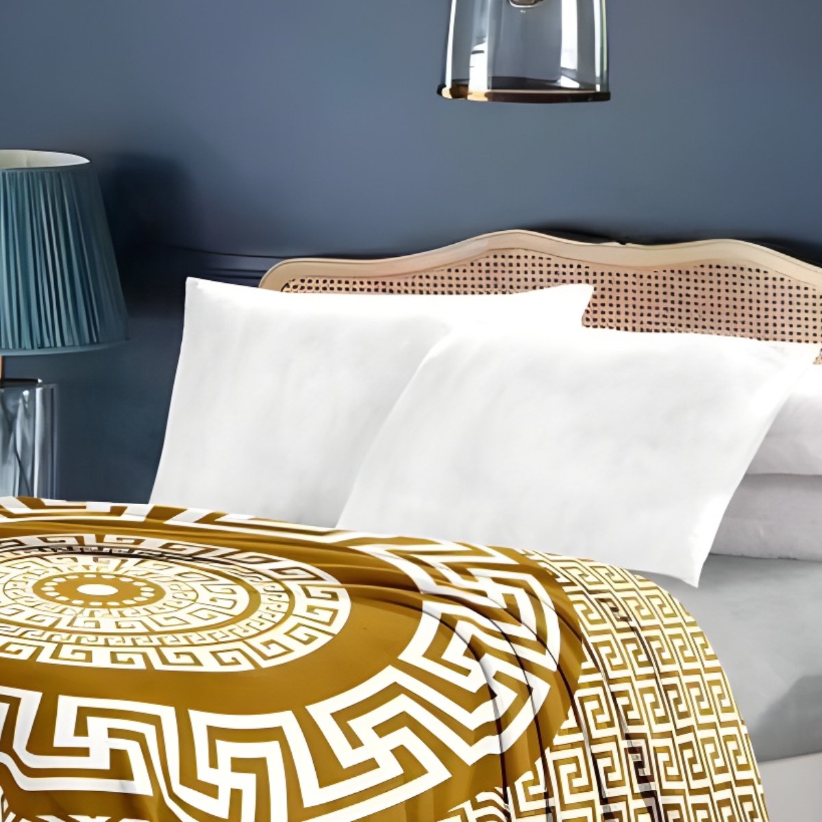 The Regal Gold Luxe Mink Blanket by Bedding King adds a touch of luxury and warmth to your bedroom with its stunning Greek key pattern. The golden yellow combined with intricate white geometric borders creates a bold, elegant look that enhances your home décor.